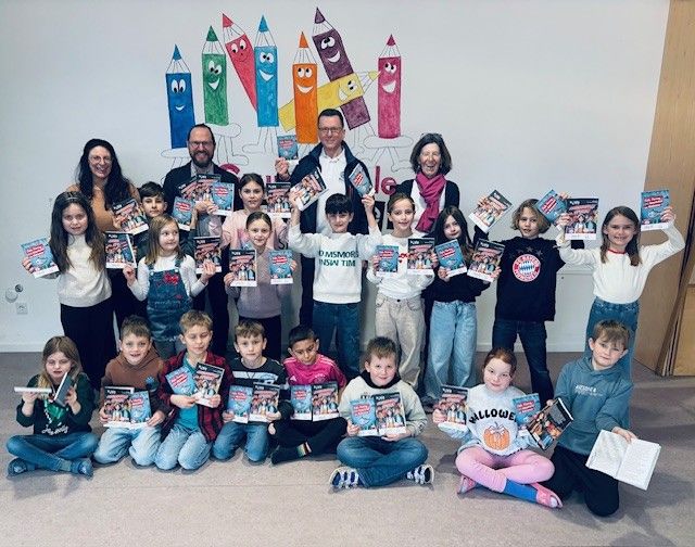 Am 3. Februar 2026 bekam die Klasse 2b der Grundschule Heldenstein Besuch – und dieser Besuch hatte zwei schwere Pakete mitgebracht! Der Präsident des Rotary-Clubs Mühldorf-Waldkraiburg Klaus-Dieter Josel und der Jugenddienstbeauftrage Josef Stellner überreichten der Klasse stellvertretend für die ganze Schule neuen Lesestoff in Form zweier Klassensätze neuer Bücher: Für die Jahrgangsstufen 1/2 erlebt Fiete Hering Abenteuer im Müllmeer, während sich die Koala-Crew in den Büchern für Jahrgangsstufe 3/4 auf Ursachenforschung zum Fischsterben im Stadtpark begibt.