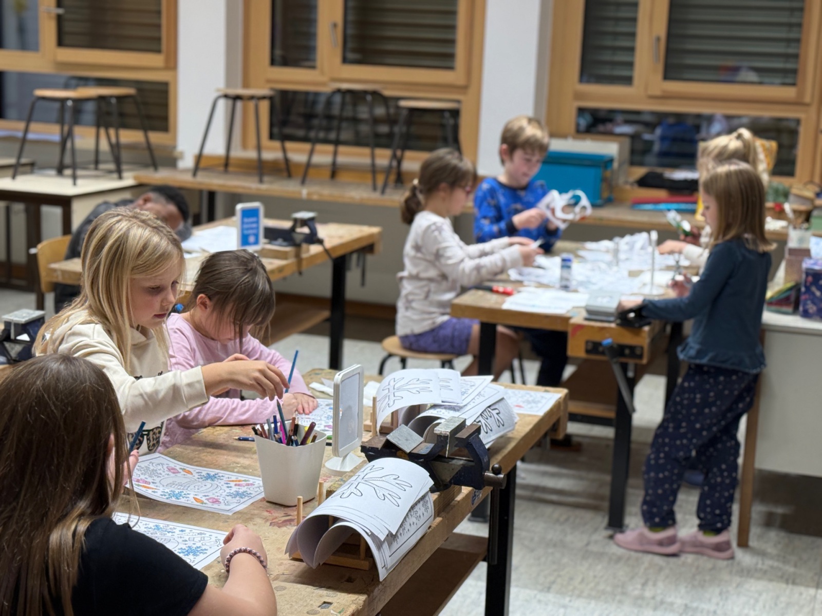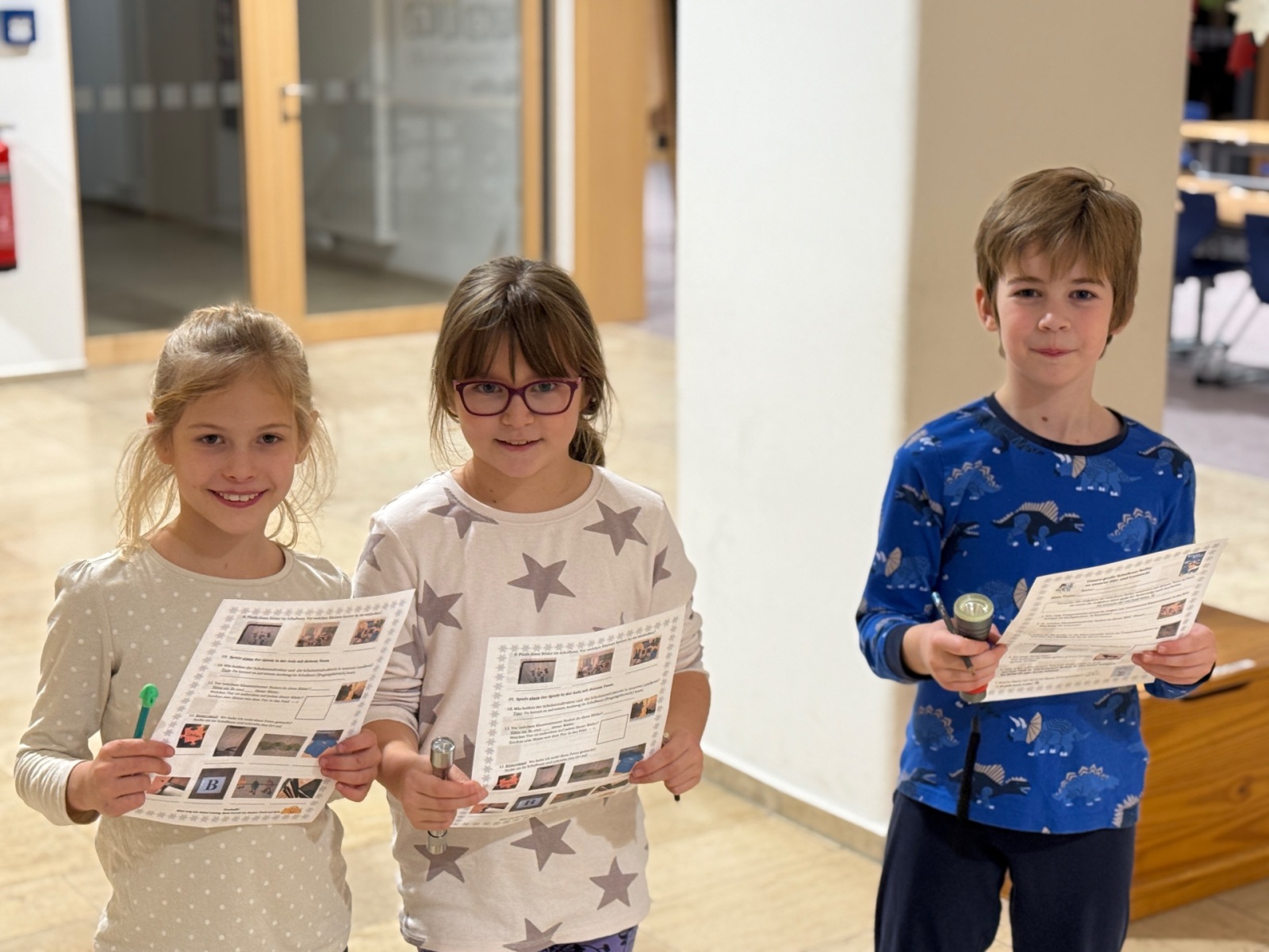 Mit der Schulhausralley folgte schon das nächste Highlight des Abends. In Gruppen und mit Stirn- oder Taschenlampe ausgerüstet zogen die Drittklässlerinnen und Drittklässler los, um die Aufgaben und Bilderrätsel im ganzen Schulhaus zu lösen und am Ende mit einem kleinen „Schatz“ belohnt zu werden.