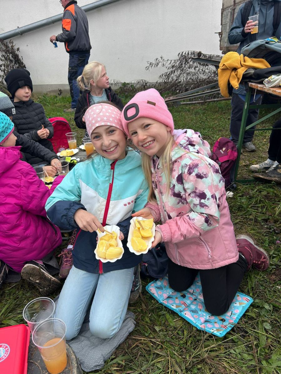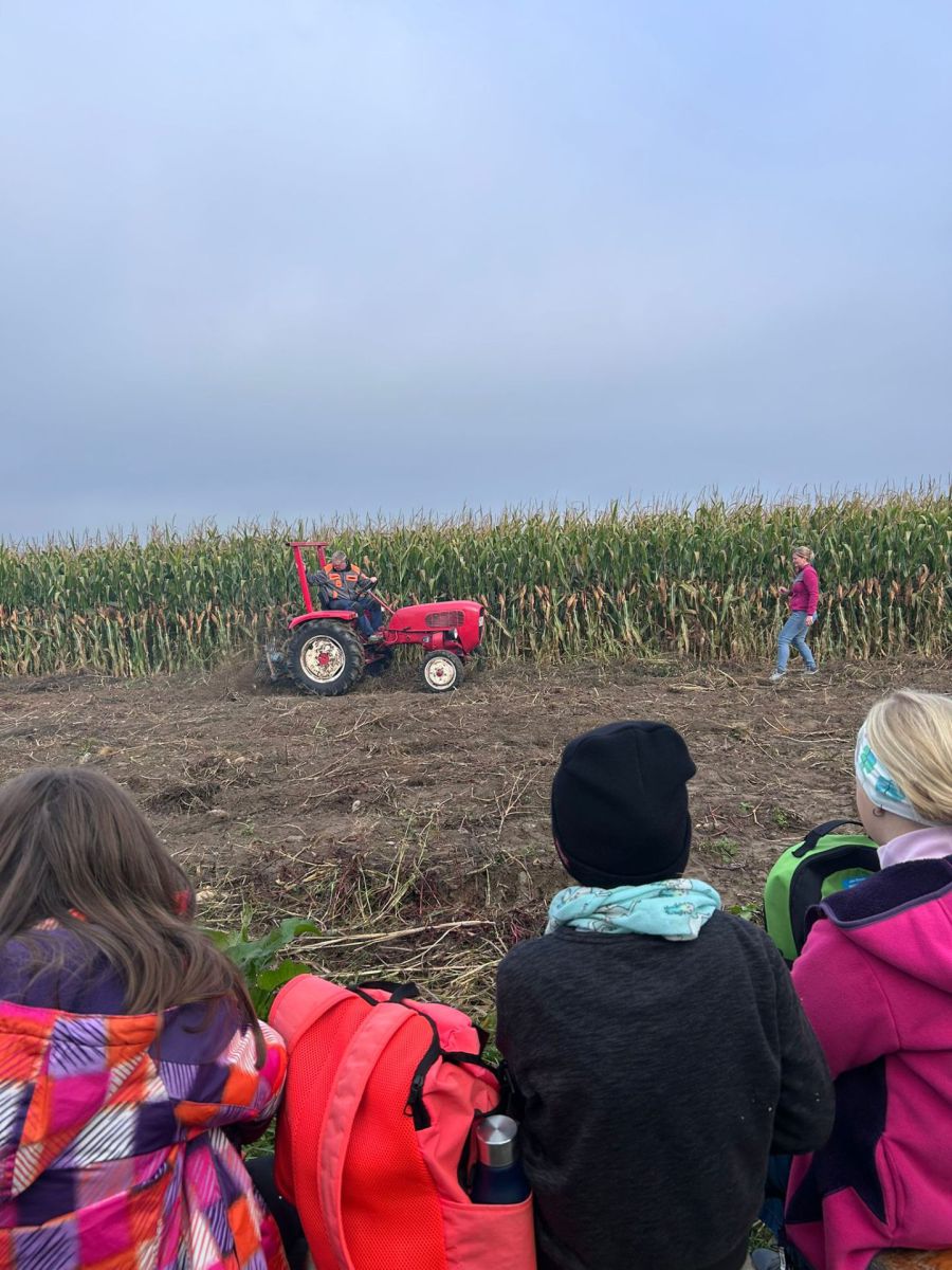 Der Wandertag am 10.10.25 wird unseren Viertklässlern wohl als einer der schönsten Schultage in Erinnerung bleiben. Beide Klassen wurden von Familie Müller eingeladen, auf ihrem kleinen Feld neben dem Schweinestall bei der Kartoffelernte zu helfen. Zunächst wurden die arbeitseifrigen Kinder mit einem kurzen Vortrag über den Kartoffelanbau begrüßt, wobei sie Wissenswertes über den Aufbau der Pflanze, ihre Kultur in Reihen, die nötige Bodenbeschaffenheit und sowie den gefürchteten Kartoffelkäfer erfuhren. Als Matthias Müller mit seinem Oldtimer-Traktor die erste Reihe Kartoffeln rodete, d.h. die Erde umgrub und die Feldfrüchte freilegte, konnten es die jungen Erntehelfer kaum erwarten, sich auf die gelben Knollen zu stürzen. Mit Gartenhandschuhen und Körben ausgerüstet wurde gesammelt, gegraben und geschleppt, was das Zeug hielt. Besondere Beachtung im Wettstreit um die beste Ausbeute fanden natürlich auffallend große, besonders winzige oder seltsam geformte Erdäpfel. Nach getaner Arbeit verköstigte Andrea Müller ihre lehmverschmierten Gäste mit frischen Butterkartoffeln und Apfelsaft. Der wahrhaft sportliche Teil jedoch stand zum Schluss bevor. Als Mitbringsel durfte jedes Kind ein Säckchen mit selbst geernteten Kartoffeln füllen, wobei sich manch einer sein Netz so vollpackte, dass der Heimweg zum Kraftakt wurde.