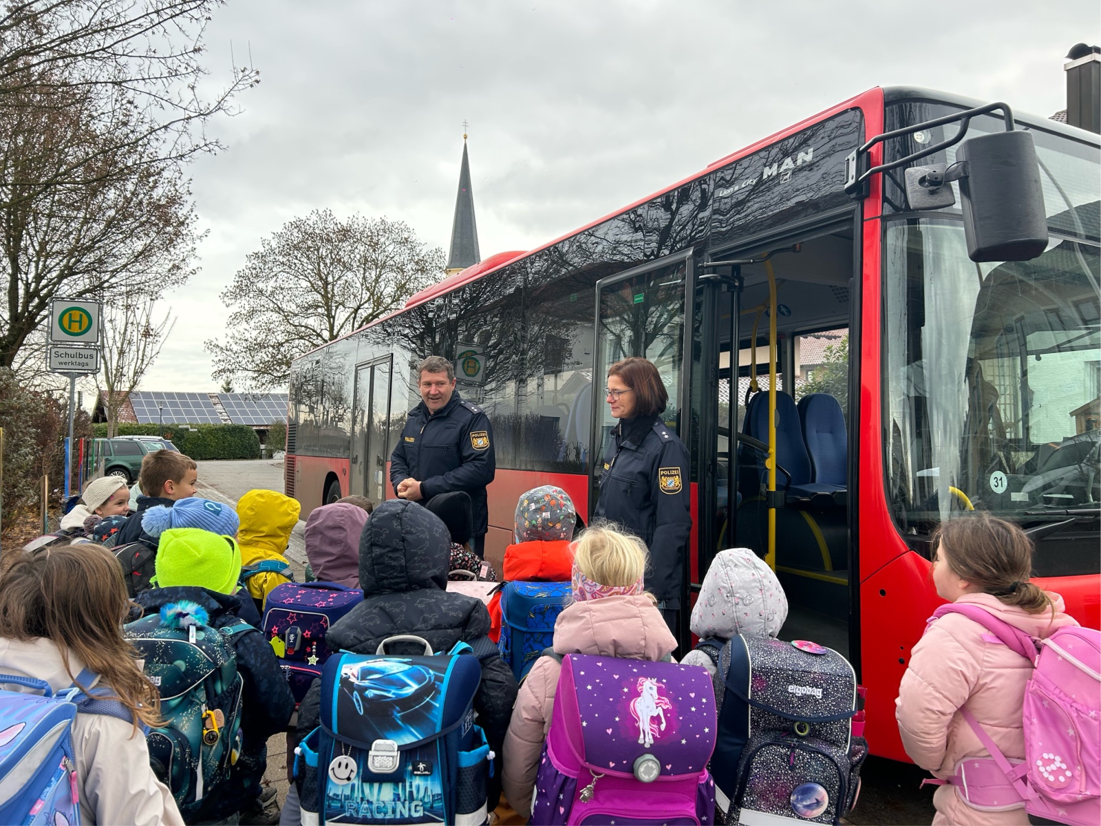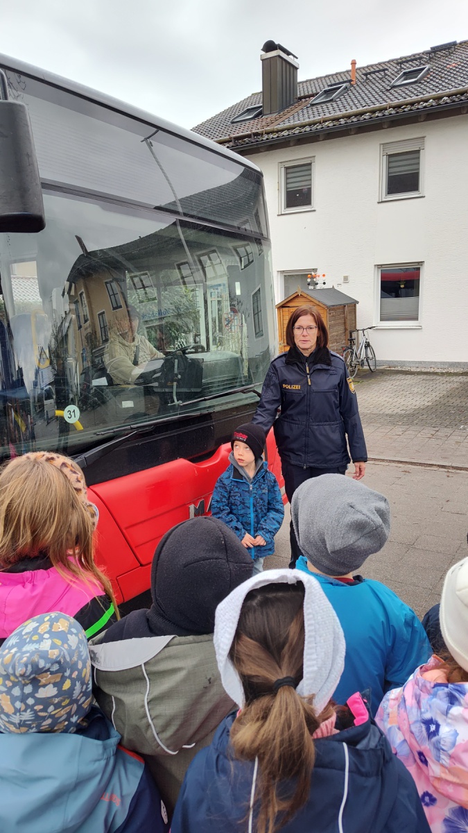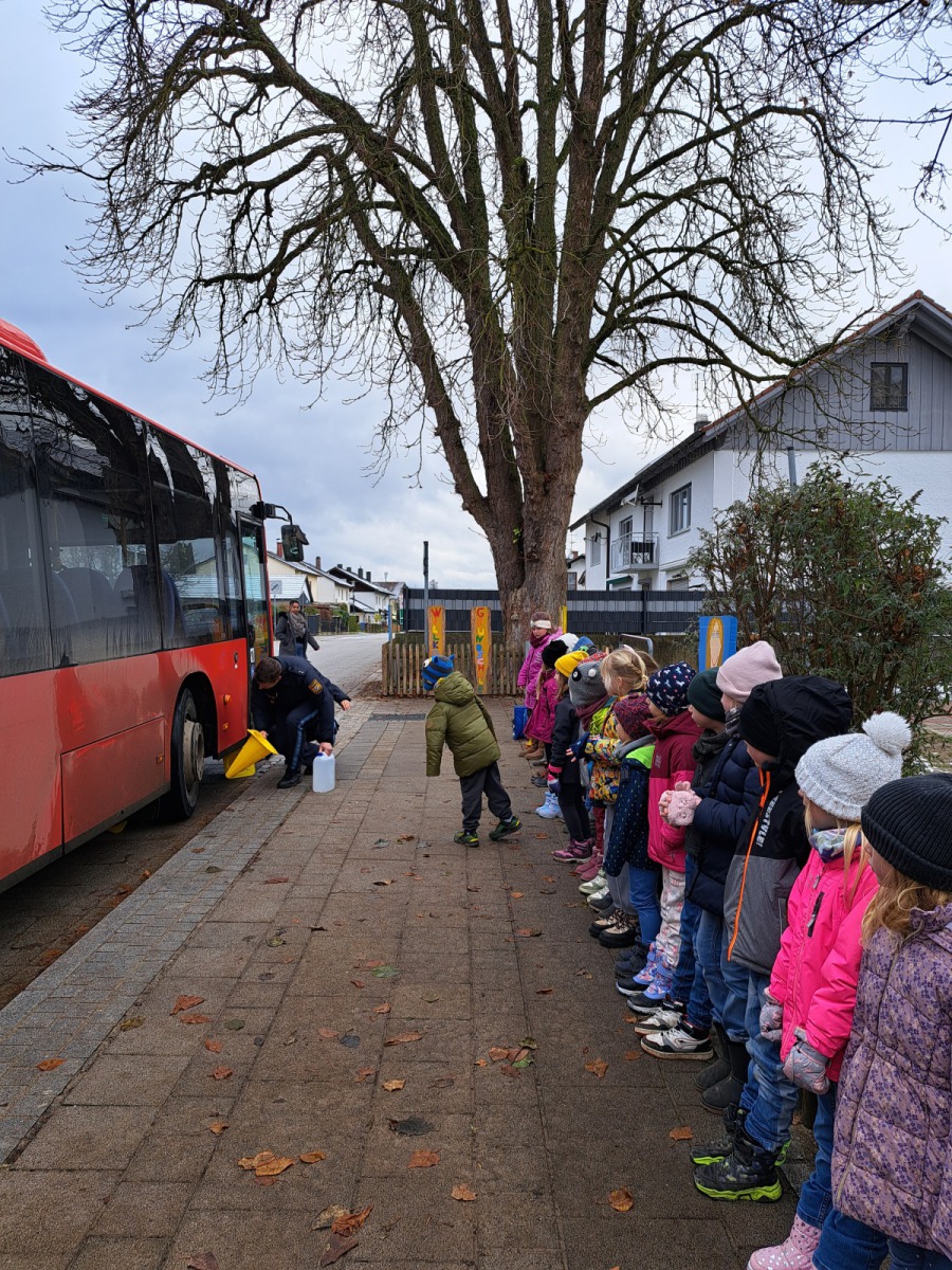Wie jedes Jahr lauschten unsere Kleinsten wie gebannt Herrn Thomas Röttenbacher und Frau Tina Kain von der Polizei Mühldorf. Durch viele praktische Übungen wurde den Kindern bewusst gemacht, wie wichtig das richtige Verhalten sowohl beim Busfahren als auch beim Warten an der Haltestelle ist. Zum Beispiel dauerte das Einsteigen mit Drängeln viel länger, auch die Wichtigkeit des Festhaltens und Sitzenbleibens beim Fahren wurde durch plötzliches Abbremsen demonstriert. Das Bustraining endete mit einem lauten Knall. Ein Wasserkanister wurde vor einen Reifen des Busses gelegt und platzte, als der Bus darüber fuhr. Trotz der Kälte hatten die Kinder eine spannende und lehrreiche Stunde.